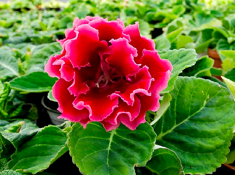 Originaria de Brasil, la Gloxinia pertenece a la familia Gesneriaceae y destaca por sus grandes flores acampanadas, que se presentan en una amplia gama de colores, desde rojos intensos hasta morados profundos, pasando por rosas suaves y blancos inmaculados. Su estructura es imponente, con hojas gruesas y aterciopeladas, que le otorgan una textura única, mientras que las flores, de forma casi perfecta, parecen sacadas de un cuadro impresionista.